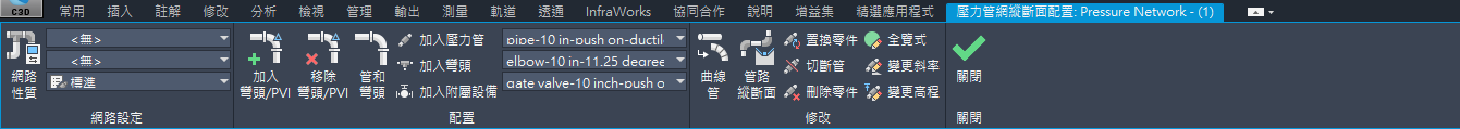 使用「壓力管網縱斷面配置」功能區處理縱斷面視圖中的壓力管網。