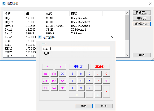 - 按兩下模型參數 (例如 LenB1) 的「公式」欄值,您可以輸入值或公式,以指定零件的長度。