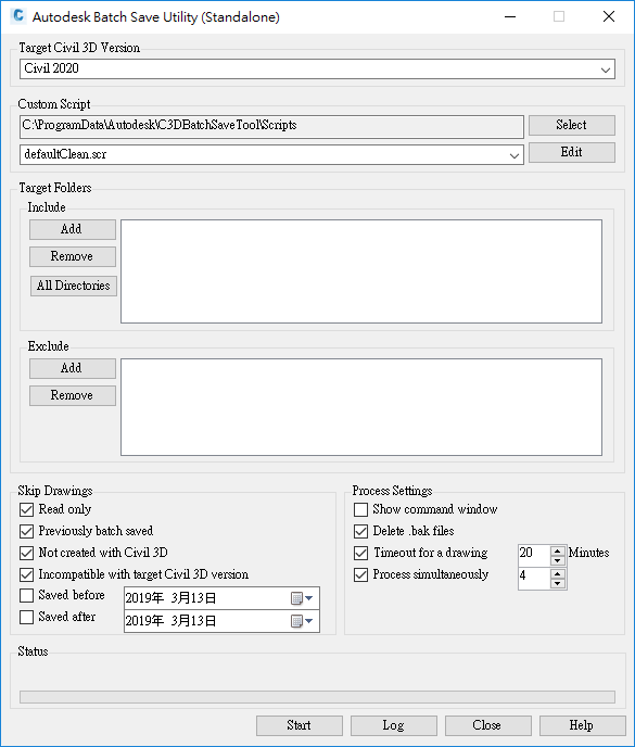 您也可以使用 Autodesk Batch Save 公用程式來執行自訂腳本,以作為批次作業的一部分。舉例而言,您可以執行腳本,以在多個圖面上執行一系列的指令,例如 -PURGE 和 AUDIT。此公用程式隨附有範例腳本,可以直接從「Autodesk 批次儲存公用程式」對話方塊檢視與編輯這些腳本。