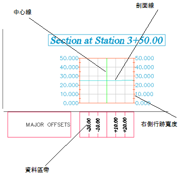 取樣線橫跨定線至指定的距離 (向左和向右)。通常,取樣線沿水平定線的給定樁號處建立。