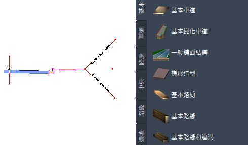 在組合基準線上加入一個或多個次組合物件 (例如行巷道、路緣和側坡),可以建立組合物件。這就構成了廊道橫斷面的設計。次組合係於一組目錄中提供的。
