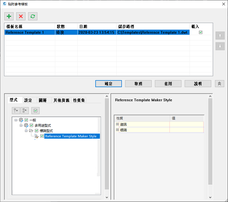 當您貼附樣板時,對話方塊的下半部將會展開,以供您檢閱設定。會顯示並選取您在參考樣板中選取的型式與設定。