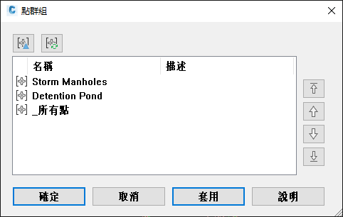 圖面的點群組顯示順序可以確定在開啟圖面或重生圖形時繪製點群組的順序。最後繪制清單中的第一個 (最高) 點群組。