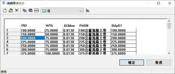 • 若要變更管大小的值,請選取列和大小儲存格。按兩下以進行編輯。