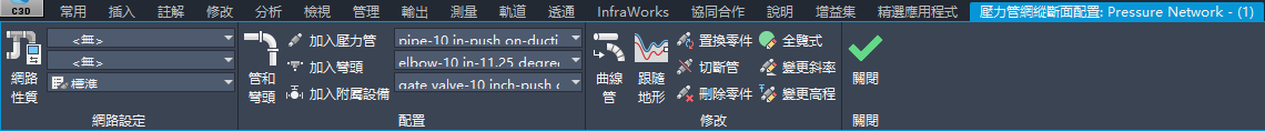 使用「壓力管網縱斷面配置」功能區處理縱斷面視圖中的壓力管網。