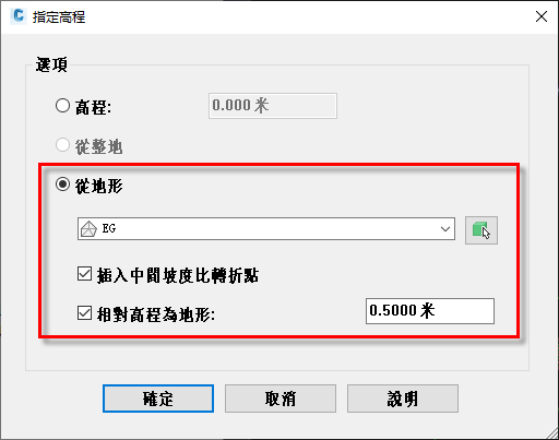 勾選方塊以在圖元與地形不規則三角網線的交叉處插入中間坡度比轉折。將在這些位置建立高程點。