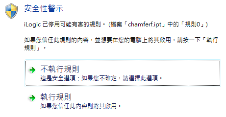 當您執行 Inventor 偵測為可能不安全的規則時,系統會顯示安全性警示。您可以選擇將該規則視為安全規則執行,或不執行該規則。如果選取「執行規則」,將顯示「iLogic 安全性顧問」對話方塊,您可在其中存取「iLogic 安全性」對話方塊,以取得管理未知程式碼的其他選項。