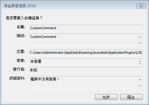 載入非 Autodesk 產品增益集時,會顯示一個新對話方塊。您現在可以選擇允許或阻止載入增益集。此設定將會保留以用於將來的階段作業。您可以使用「增益集管理員」檢查和變更「允許」/「阻止」設定。