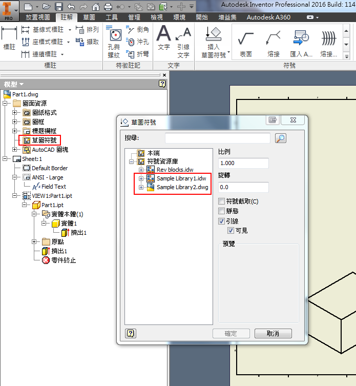 草圖符號資源庫同時支援 IDW 和 DWG 檔案類型
