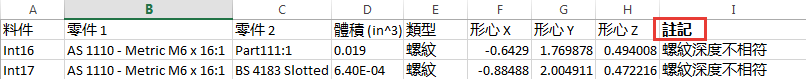 螺紋干涉值複製到 Excel 時,干涉類型會包括在名為「註記」的新欄中。