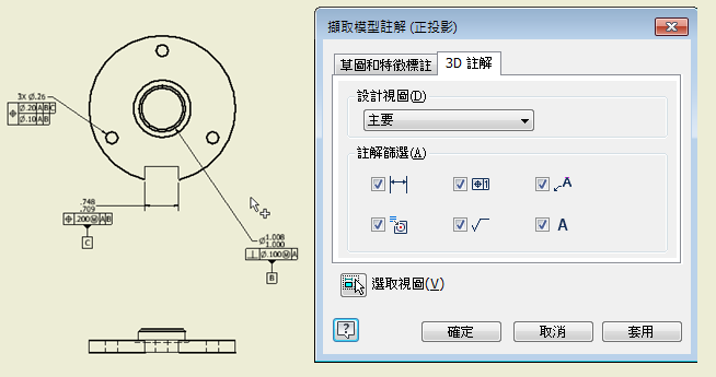 「擷取」對話方塊中新的「3D 註解」頁籤,可讓您恢復零件中的 MBD 資訊,並將其用於圖面。使用「設計視圖」和篩選選項,可查看所需的資訊。