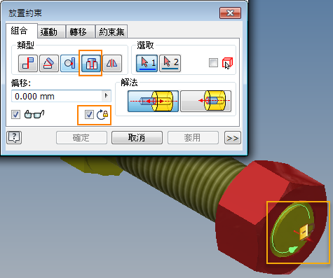 放置插入約束時,使用新選項「鎖住旋轉」,可在元件上鎖住旋轉自由度。此選項可避免零件發生旋轉。