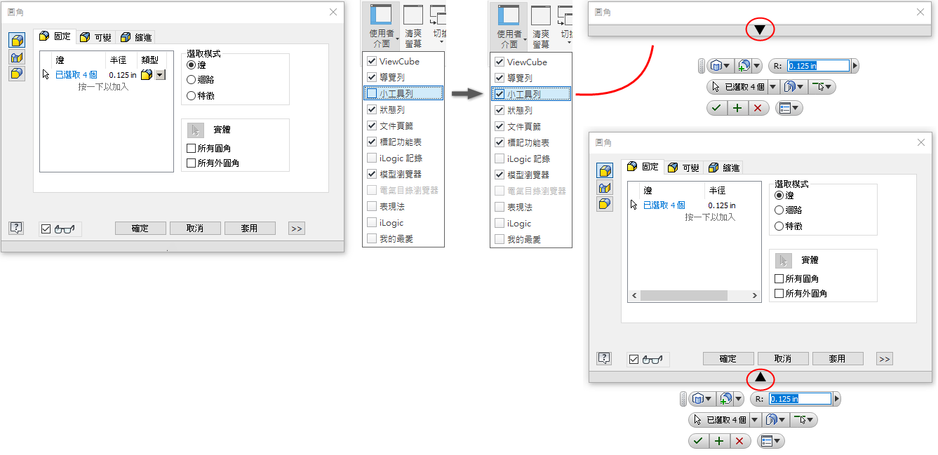 隨 7 個 Inventor 對話方塊 (「擠出」、「迴轉」、「圓角」、「薄殼」、「面拔模」、「倒角」和「接頭」) 顯示的小工具列,不再依預設顯示。您可以選擇要顯示還是隱藏小工具列。若要設定您的偏好:在功能區上,按一下「檢視」