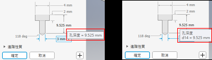 對於「孔」指令,在您輸入值時,如果值無效 (例如,指定的螺紋長度大於孔深度),值顏色會變為紅色,並且工具提示會報告值無效。這可讓您立即更正該值,或找到需要編輯來讓該值有效的其他值。如果值有效,值顏色為黑色。
