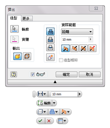 隨 7 個 Inventor 對話方塊 (「擠出」、「迴轉」、「圓角」、「薄殼」、「面拔模」、「倒角」和「接頭」) 顯示的小工具列,不再依預設顯示。您可以選擇要顯示還是隱藏小工具列。若要設定您的偏好:在功能區上,按一下「檢視」