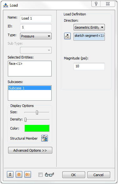 類似於「約束」,您可以拖放「負載」,或按一下滑鼠右鍵並選擇「子案例 - 編輯」,並將其亮顯,以將其包含在「分析」中。