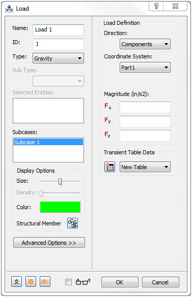 重力是以位於圖形視窗右下角的小圖像 (字母 G 和箭頭) 表示。箭頭不表示定義的重力加速度向量的實際方向。重力永遠向下。「負載」對話方塊「顯示選項」區段中的大小、密度和顏色設定不會影響重力圖像的外觀。