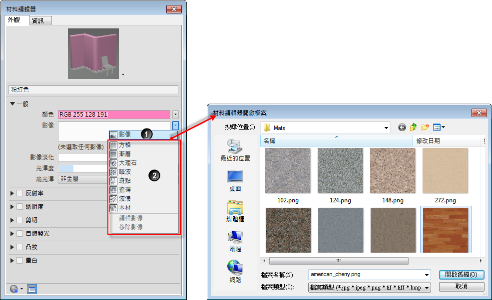 有兩種類型的材質:1 - 影像材質,2 - 程序材質。