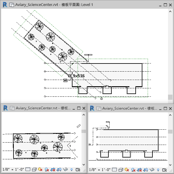 例如,在下圖中,頂部視圖展示圍繞主建築和鳥舍側翼的範圍框。範圍框 1 套用到主建築的網格線,範圍框 2 則套用到鳥舍側翼的網格線。因此,從屬視圖 (底部) 僅展示套用到建築各部分的網格線。