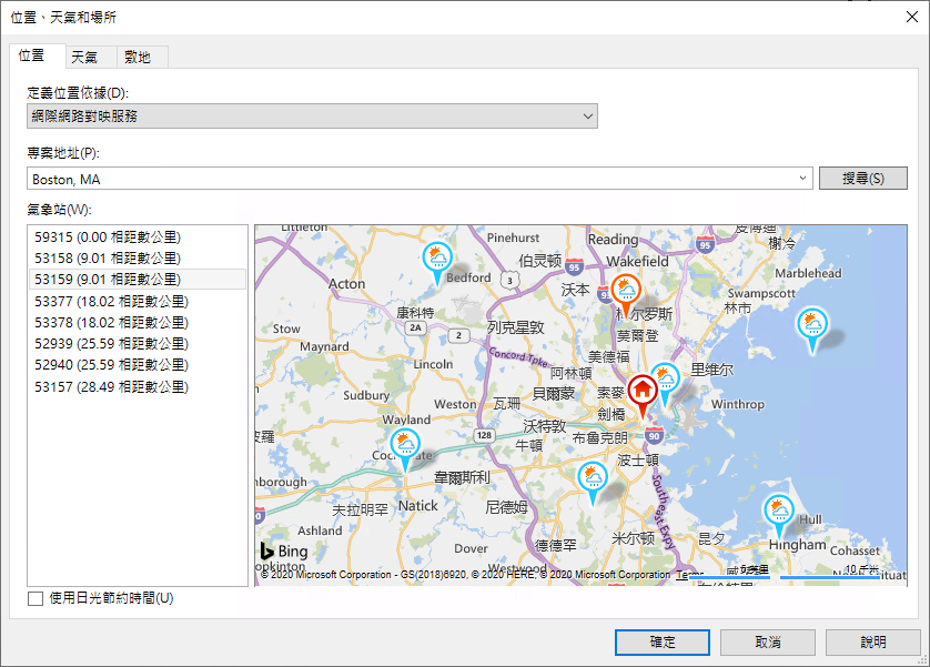 可用氣象站也會顯示在地圖中以及左側清單中。一般而言,您應選擇最接近您的位置的氣象站。但是,您可能想要選擇附近的氣象站,其高程和土地或水特徵更好地反映模型的位置。