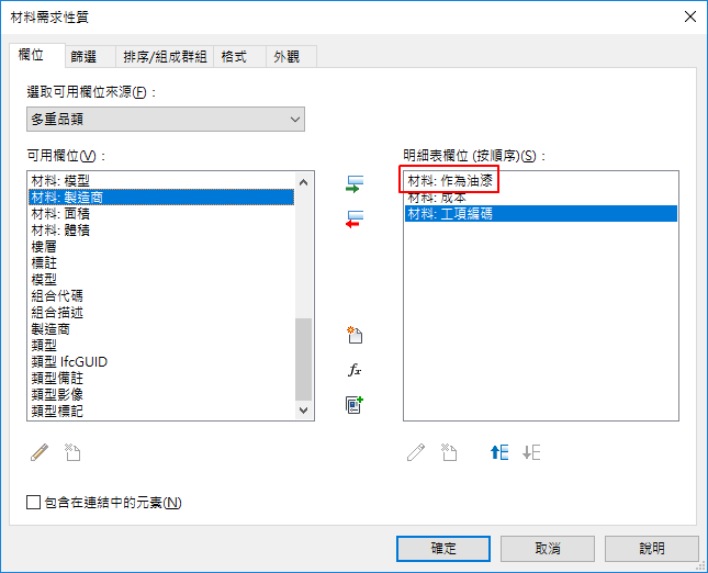 - 對於製作計量報告和製作明細表,使用油漆工具所套用的材料將可從用作主體物件元素的主體材料中區分出來。