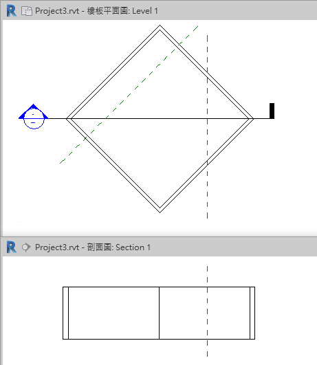 例如,下列樓板平面圖展示 2 個參考平面,以綠色虛線表示。左側的參考平面與剖面線相交成一個角度。右側的參考平面與剖面線互垂。由於斜角參考平面不與剖面線互垂,因此平面不會出現在產生的剖面視圖中。不過,互垂參考平面一定會顯示在剖面視圖中。