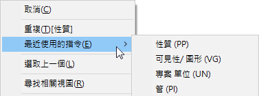 在圖面中按一下右鍵,然後按一下「最近使用的指令」