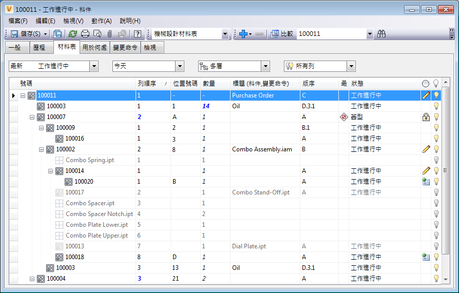請務必瞭解「材料表」頁籤的圖示和狀態設定,以便妥善管理材料表。