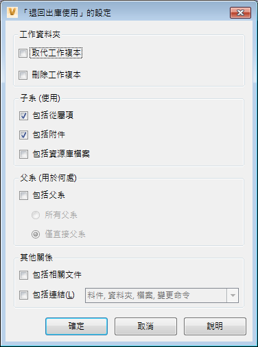 抑制「退回出庫使用」對話方塊後,您可以指定對應的 Vault 作業如何影響相關檔案。