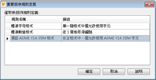 - 在「變更版序規則定義」對話方塊中,選取要指定給所選料件的新版序規則。按一下「確定」。