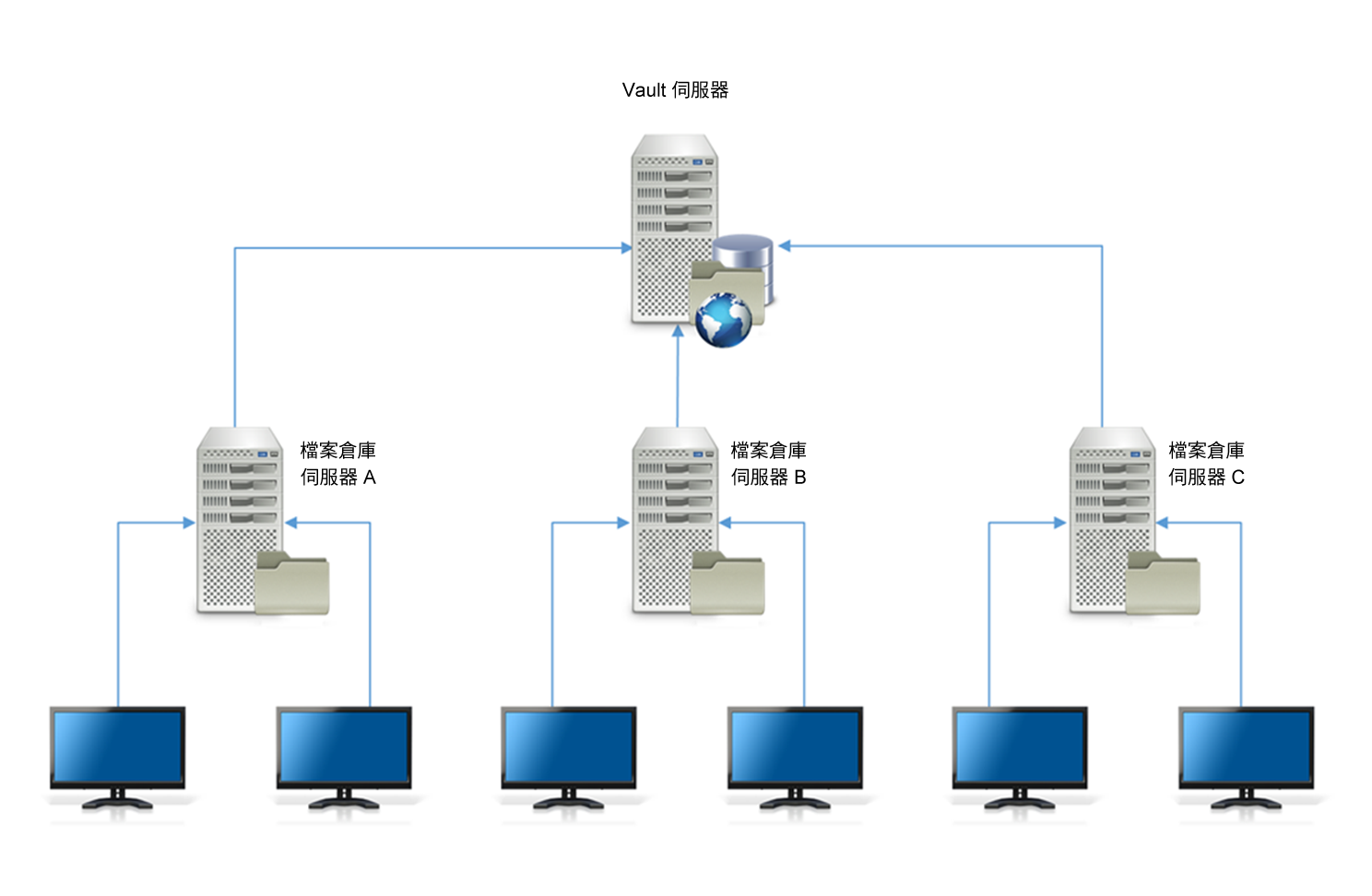 第一種方法是集中所有站台的資料庫。Vault 的資料庫可以位於獨立的伺服器上,如下圖所示。