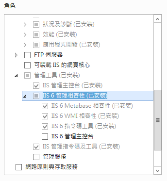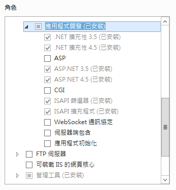 - 選取左側的「伺服器角色」並勾選「角色」清單中的「網頁伺服器 (IIS)」。
