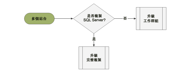最佳做法是從可最快連接至 SQL 伺服器的站台開始。準備好執行升級時,請遵循〈單一站台〉一節中所述步驟。將選取的伺服器升級至最終版本和 Service Pack,然後再處理其他站台。