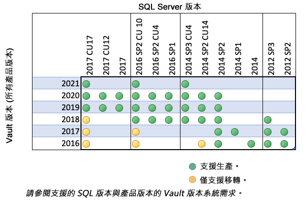 以下圖表總結了 Vault 和 SQL 的相容版本 (以綠色圓點表示)。黃色圓點表示建議的升級路徑。請參閱您的 Vault 版本對應的 Vault 系統需求,以確保 Vault 和 SQL 產品版本之間的相容性。