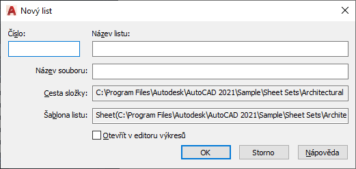 Určuje název nového výkresového souboru obsahujícího list. Implicitně jen názvem výkresového souboru číslo listu a název listu. V tomto textovém poli také lze změnit název výkresového souboru.