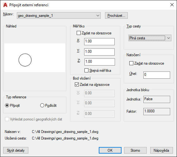 Vyberte úplnou (absolutní) cestu, relativní cestu k souboru externí reference nebo možnost Žádná cesta a název souboru externí reference (soubor musí být umístěn ve stejné složce jako aktuální výkresový soubor).