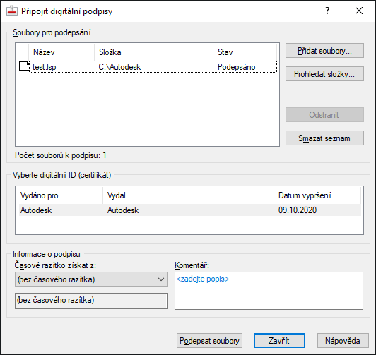 Připojí digitální podpis ke každému souboru uvedenému v tomto dialogu.