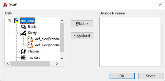 Přesune pojmenované definice objektů zvýrazněné v seznamu externích referencí do seznamu Definice k vázání.
