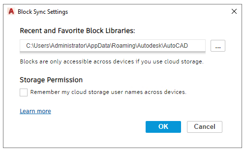 Tlačítko Nastavení synchronizace bloků v dolní části palety Bloky je dynamické a označuje, zda jsou poslední a oblíbené bloky synchronizovány v cloudovém úložišti.