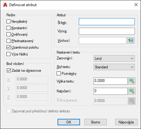Určuje umístění atributu. Zadejte hodnoty souřadnic nebo klikněte na možnost Zadat na obrazovce a pomocí ukazovacího zařízení určete umístění atributu vzhledem k jiným objektům.