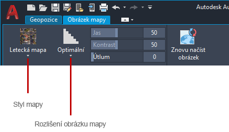 Při výběru obrázku mapy se na pásu karet zobrazí kontextová karta Obrázek mapy. Tuto kartu lze zobrazit, pouze pokud jste přihlášeni k účtu služby Autodesk.