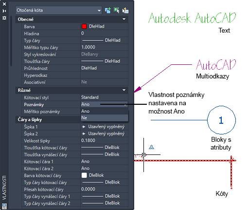 Objekty poznámek obsahují kóty, poznámky a další typy vysvětlujících symbolů nebo objektů, které jsou běžně používány k přidávání informací k výkresu.