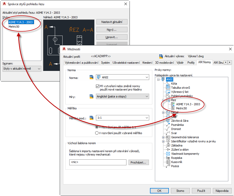 . Pouze styly řezů aplikace Sada nástrojů AutoCAD Mechanical mohou získat nastavení textu a odkazu z hlavních nastavení normy kreslení.