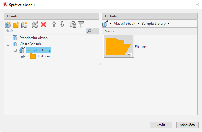 Příkaz AMCONTENTMANAGER zobrazuje dialog Správce obsahu, který obsahuje řadu nástrojů k vytváření a správě knihoven obsahů.