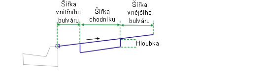 Spojnice vnitřního travnatého pásu a vnějšího travnatého bulváru se vloží směrem od bodu připojení s daným sklonem. Travnaté pásy je možné vynechat zadáním nulové šířky.