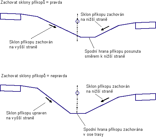 Klopení nebo odbočovací pruhy mohou být příčinou, že horní části sklonů příkopu budou na levé a pravé straně v různých výškách, což vede ke vzniku asymetrického příkopu. Jsou dvě možnosti, jak řešit tuto situaci. Jestliže pole Zachovat sklony příkopu má hodnotu Ano, pak dané sklony příkopu se zachovají na obou stranách, čímž se posune příkop od středové osy k nižší straně. Jestliže má hodnotu Ne, spodní část příkopu se vycentruje kolem středové osy středního dělicího pásu, daný sklon se zachová na nižší straně a sklon se upraví tak, aby odpovídal vyšší straně.