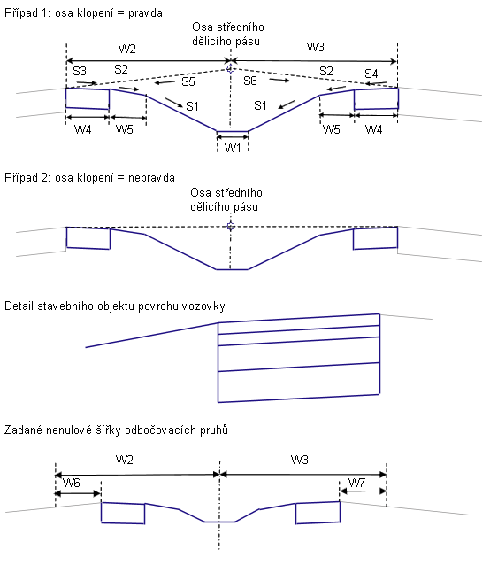 Tato podsestava funguje pouze s typy vozovek, které mají vybrány možnosti Metoda otáčení hran středního dělicího pásu a Úprava středního dělicího pásu v položce Zachovat tvar středního dělicího pásu. Pokud použijete tuto podsestavu s jinou metodou otáčení nebo s úpravou deformovaného středního dělicího pásu, výsledek bude stejný jako při použití možnosti Hrany středního dělicího pásu v položce Zachovat tvar středního dělicího pásu.