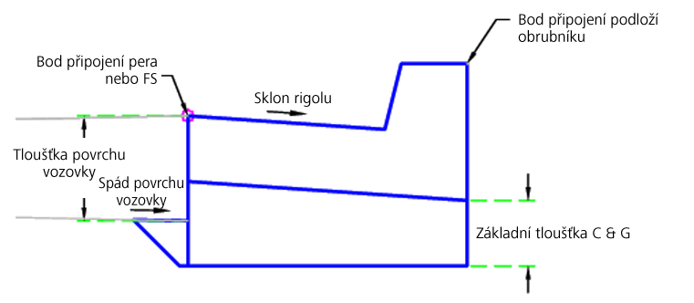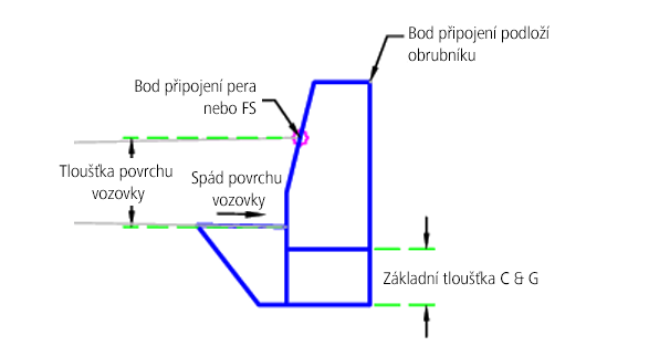 Počáteční bod se nastaví v bodu připojení. Body, spojnice a tvary obrubníku a rigolu se vytvoří na základě vybraného typu obrubníku. Následně se pod obrubník a rigol umístí základna.