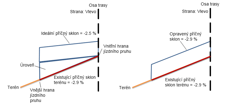 | Opravený příčný sklon | Opravený příčný sklon bude mít hodnotu -2.5 %. |
