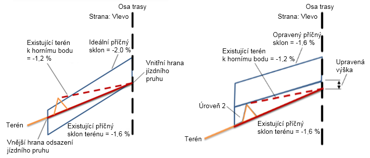 | Tolerance sklonu | Sklon existujícího terénu mínus ideální příčný sklon se rovná -1 %, což je hodnota větší než tolerance sklonu (0.5 %). |